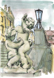 Como en una sesión de dibujo, organizamos una escena por el gusto de verla escenificada, pero en vez de dibujar, hago fotos. Alguien salta en una azotea, y la secuencia de fotos de los saltos es como un stop-motion en el que una mujer dorada, sentada en una escoba también dorada, pasa volando junto a una persona de pie, de espaldas, que no llega a darse cuenta de lo que sucede. En otra foto alguien levita horizontal al suelo. Todas las fotos presentan una extraña factura poética que me tiene entusiasmado.